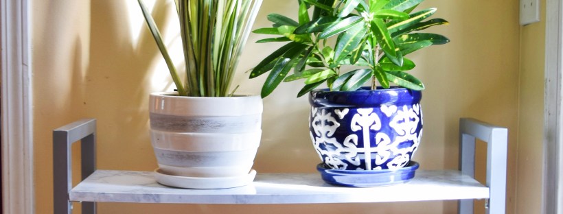 Currently, I have all my plants out in the sunroom where they get plenty of light. I have been using my sister’s old bookcase from college ( a.k.a. my hand-me-down bookcase in college) as a plant stand, but it’s been looking a little raggedy with water damage and scratches. With a free weekend, I decided to give my plant stand a makeover! Check out how I did it below with pictures in the slideshow below.